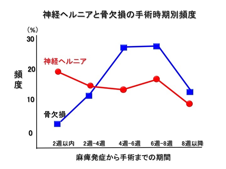 このことから、病態としては次のように推測することができます。まず神経に炎症が起こると急性期は骨の薄いところで骨が裂けてヘルニアが起こります。そして1ヶ月ぐらい経つと腫れが引いてきますので、その時期に手術をすると骨欠損だけが残っている状態になるのではないかと考えています。