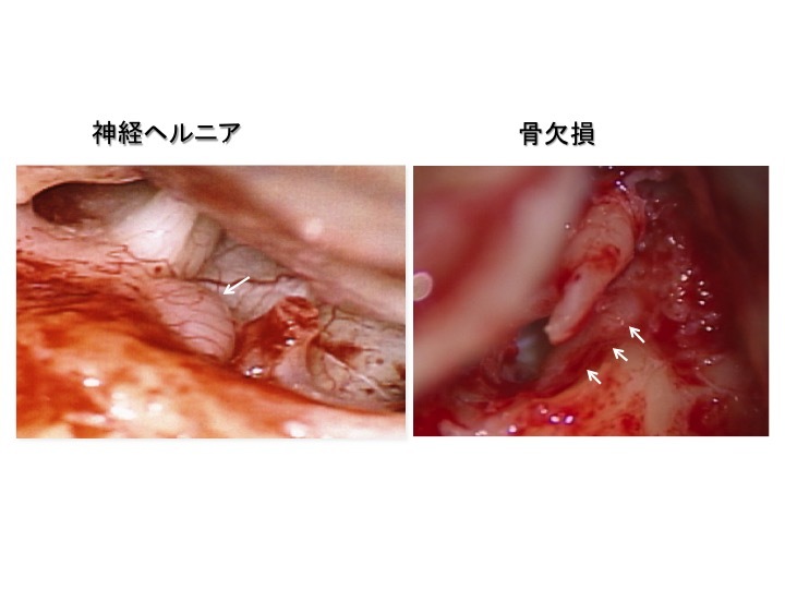 神経絞扼による圧迫を取り除くことを減圧といいます。神経が通っている骨を削り、神経の鞘を切り開いて減圧する手術が顔面神経減荷術(がんめんしんけいげんかじゅつ)です。減荷術を行なった際に顔面神経を注意深く観察してみると、本来は骨の中に入っているはずの神経が腫れて骨からはみ出しヘルニアを起こしていたり、骨が融けて欠損していることがあります。このことから、明らかに神経の浮腫が起こっていたことがわかります。ベル麻痺の30%ぐらいに、明らかに神経ヘルニアまたは骨欠損がみられます。手術した時期によってヘルニアと骨欠損の観察結果を分析すると、発症後早い時期にはヘルニアが多く、遅い時期には骨欠損の頻度が高くなっていることがわかりました。