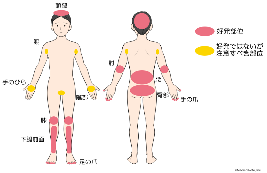 乾癬の症状は全身のどこにでも起こる可能性がありますが、こすったり傷ついたりなどの刺激を受けやすい頭部、肘、膝、腰、臀部、下腿前面などに生じやすい特徴があります。