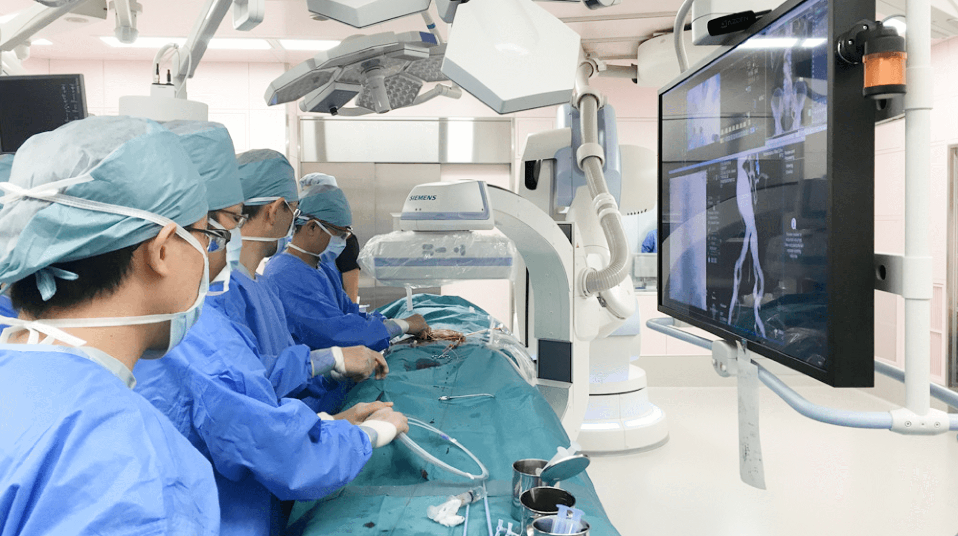 当院は2016年から外科手術とカテーテル治療の両方が実施可能なハイブリッド手術室を導入しています。症例に応じて開胸して行う人工血管置換術への切り替え、あるいは両者を組み合わせたハイブリッド手術も行っています。