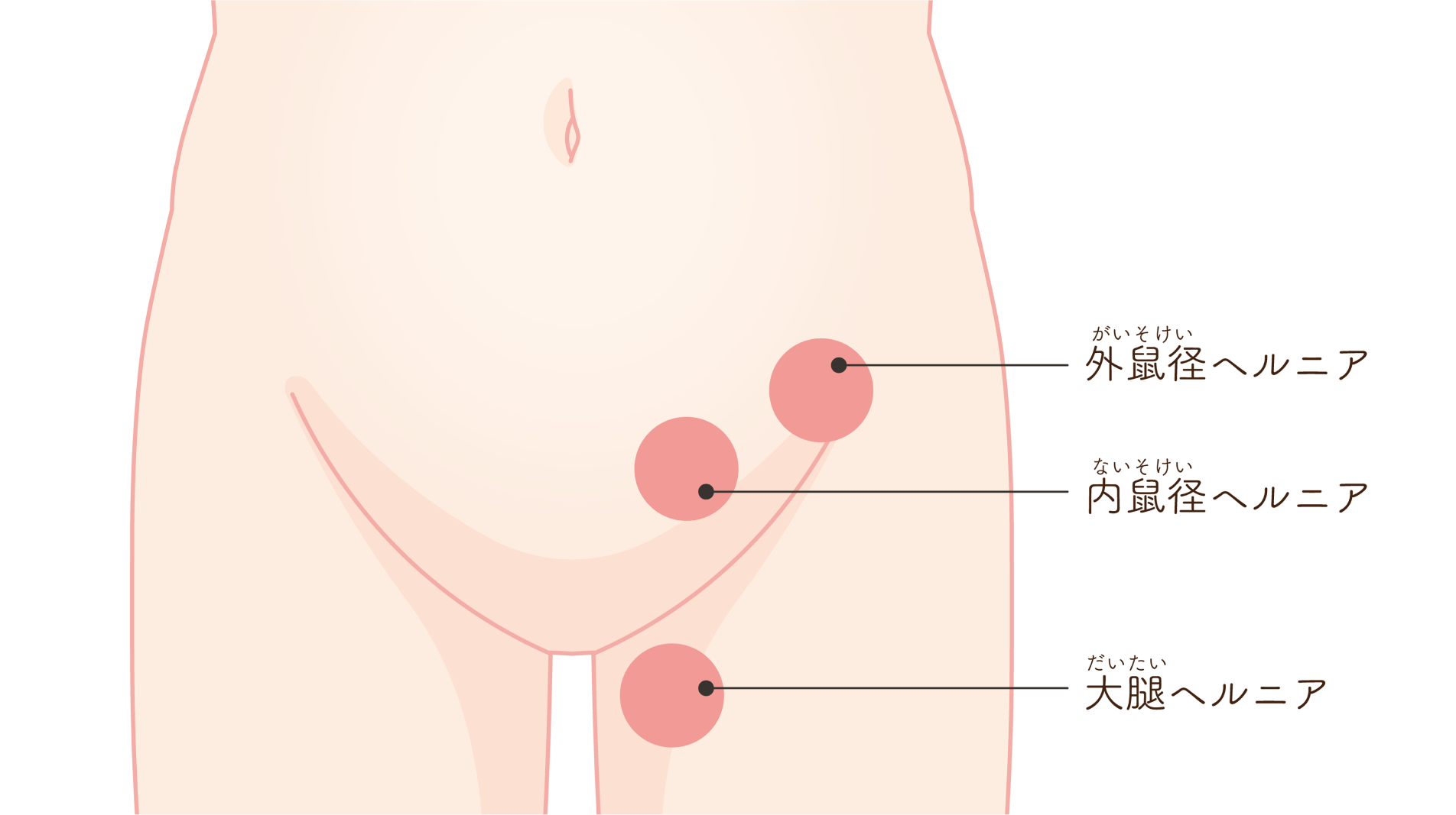 鼠径ヘルニアとは、鼠径部(太ももの付け根のあたり)の筋肉が弱り、腹壁の隙間から小腸などの内臓が飛び出た状態のことです。飛び出す場所は3か所あり、鼠径部の外側から出てくる外鼠径ヘルニア、鼠径部の内側から出てくる内鼠径ヘルニア、鼠径部の下側から出てくる大腿へルニアの3つを総称して鼠径ヘルニアと呼びます。子どもと高齢の方に多くみられるのが特徴で、子どもの場合は先天的な要因が、高齢の方の場合は加齢によって筋肉が衰えることが原因です。
