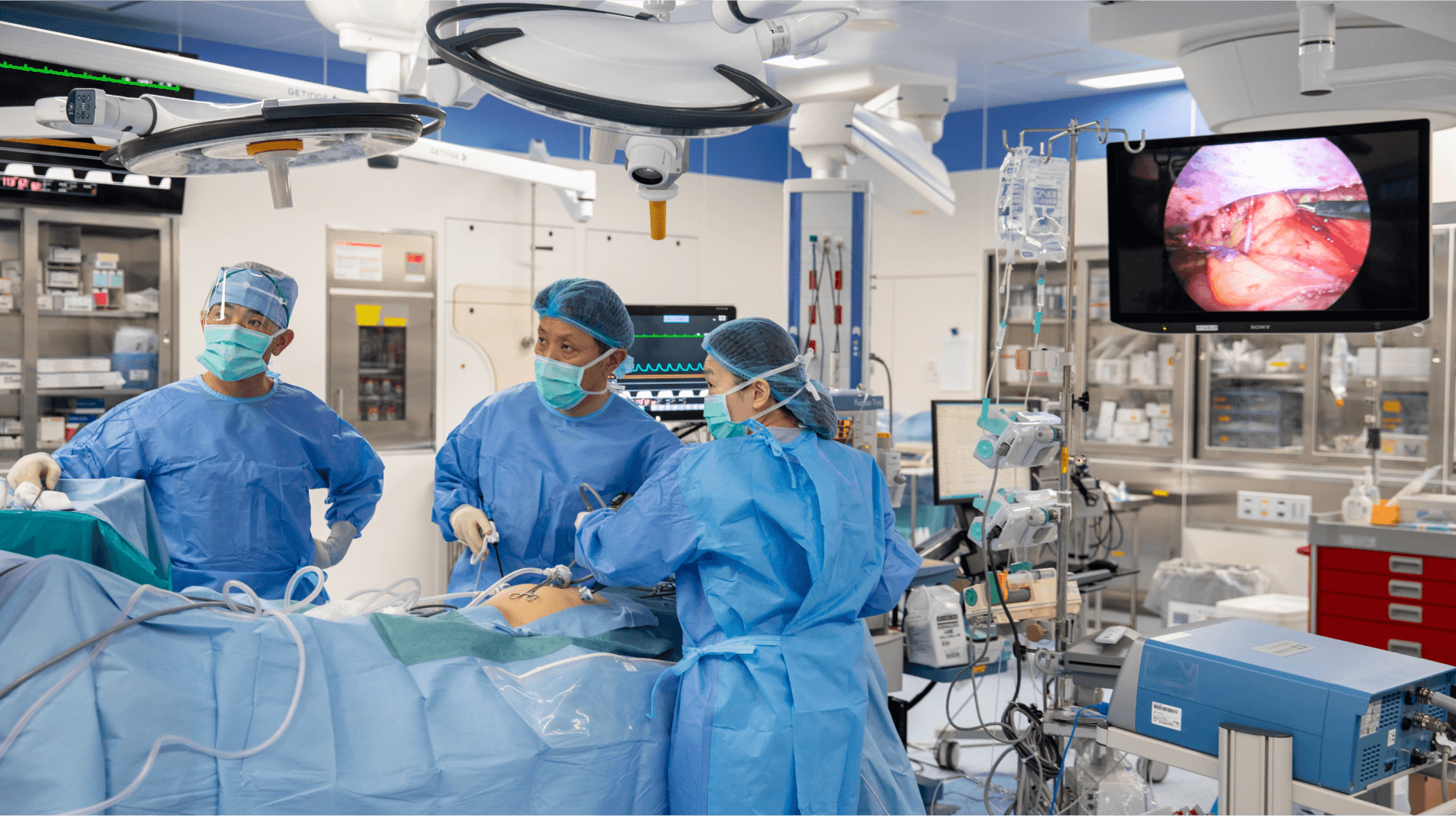 当院では患者さんの体の状態に合わせた術式で治療できることが強みです。手術には鼠径部を切開する方法と腹腔鏡を用いる方法がありますが、当院は術後の痛みが比較的少ない腹腔鏡による手術を基本としています。この手術では腹部に数か所の穴を開けてそこから内視鏡(細長いカメラ)や鉗子を挿入して手術をします。鼠径部を大きく切開しないため術後の痛みが少ないだけでなく、早期回復も見込める方法です。ただし、心肺機能に不安がある方や過去に前立腺の全摘術や下腹部の手術を行っている方などは鼠径部切開法が適応となります。