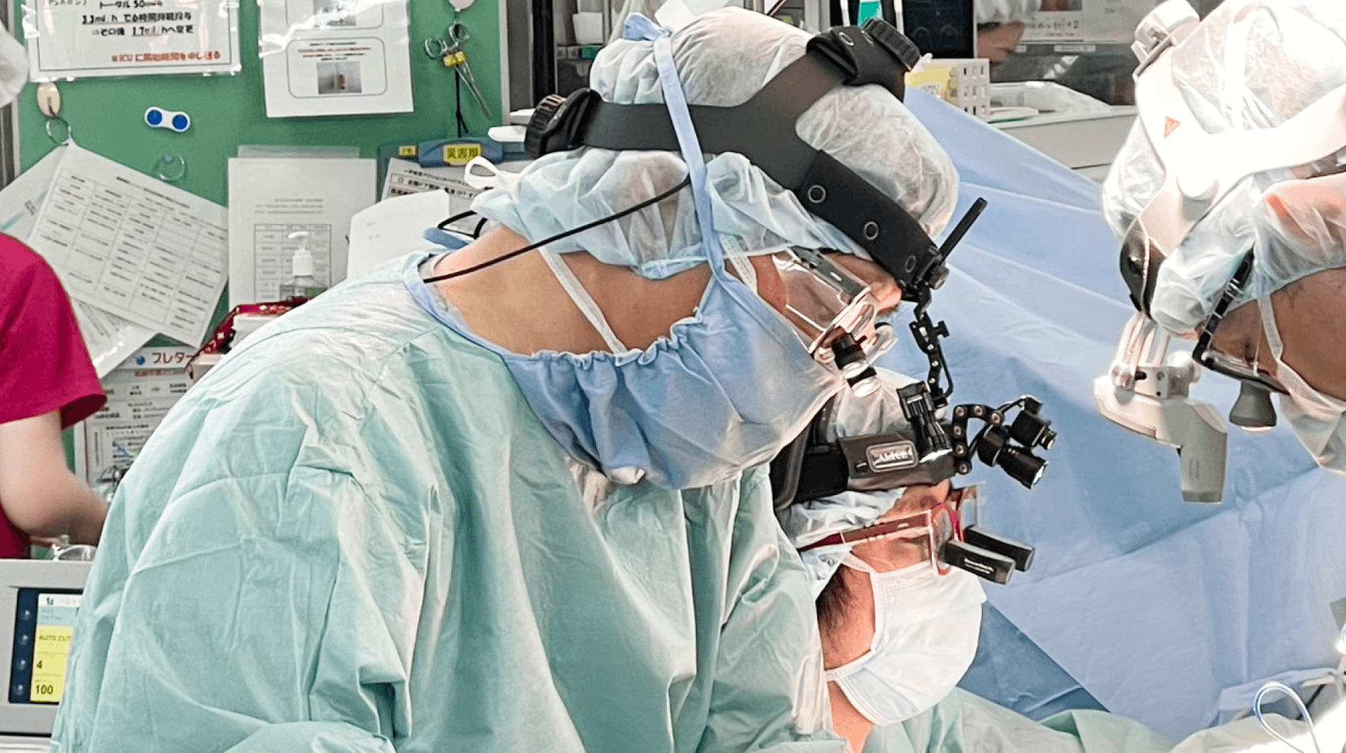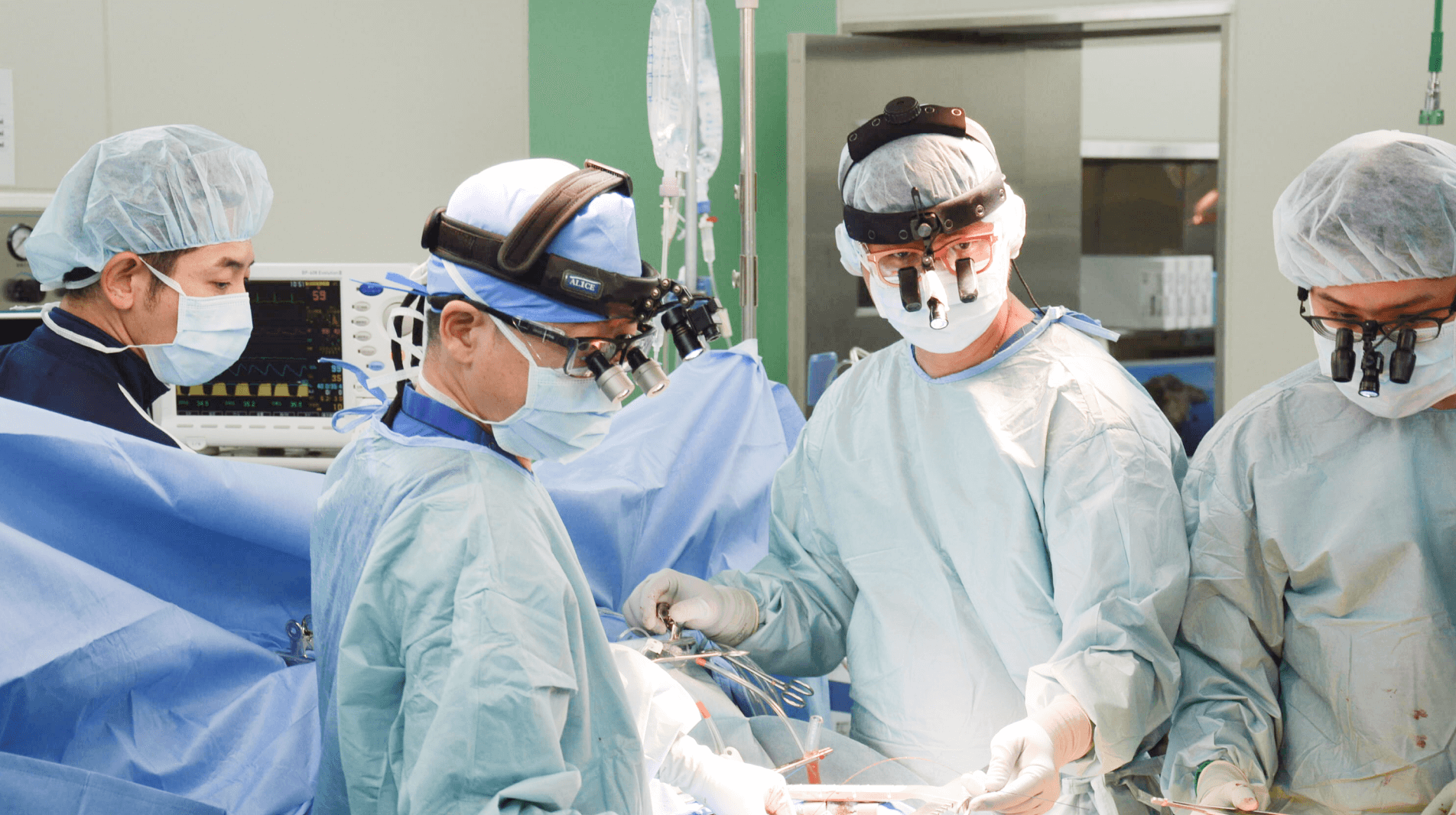 当院では心臓弁膜症に対する治療として、従来の開胸手術(胸骨正中切開手術)と、胸腔鏡で行うMICS(低侵襲心臓手術)を行っています。患者さんの耐術能(心肺機能のはたらきなどから想定される手術に耐えられる力)から、どちらかの術式を選択します。胸骨正中切開手術はどの弁の治療にも対応できるメリットがあります。しかし、胸部を20~30cm程度切開する必要があるうえ、人工心肺装置を用いて(心臓の動きを止めて)行う手術のため患者さんの体に負担がかかることから、比較的若い方におすすめしています。一方、胸腔鏡を使うMICSは右胸の肋骨の間を約7cm程度切開し、原因となる弁にアプローチする方法です。心臓を止めるのは同様ですが、骨を切らないため出血が少なく低侵襲で済むことから、主に僧帽弁を治療する患者さんに適応となります。