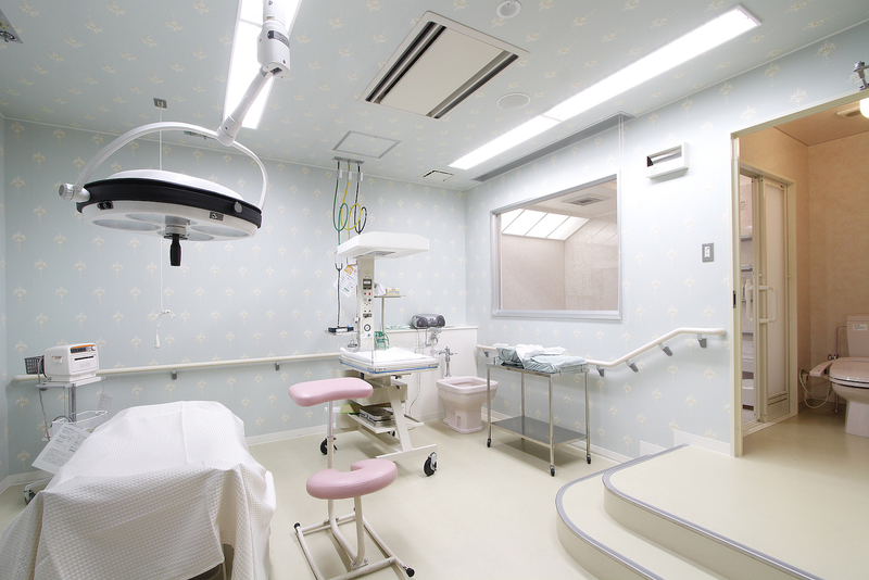 産科の病室は、ベビーピンクもしくはペールライムを基調としており、産前産後のご家族の時間を気兼ねなく過ごしていただけるようプライバシーに配慮して全室完全個室です。お産の疲れを癒すためにアロママッサージのサービスをしています。