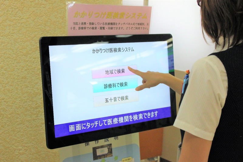 また逆紹介が容易になるよう、玄関ホールに、タッチパネル式のかかりつけ医検索システム「どこだ兵衛」を設置しました。かかりつけの先生が当院の医療連携機関に登録されると、「どこだ兵衛」に情報が掲載されます。患者さんは「地域」、「診療科」、「50音順」のいずれかでかかりつけ医の先生を検索し、情報を確認できます。表示情報は、クリニック名、医師名と診療科、診療時間や休診日、住所や連絡手段などです。タッチパネル上の「印刷ボタン」を押せば、A4用紙に印刷され、患者さんは持ち帰ることが可能です。