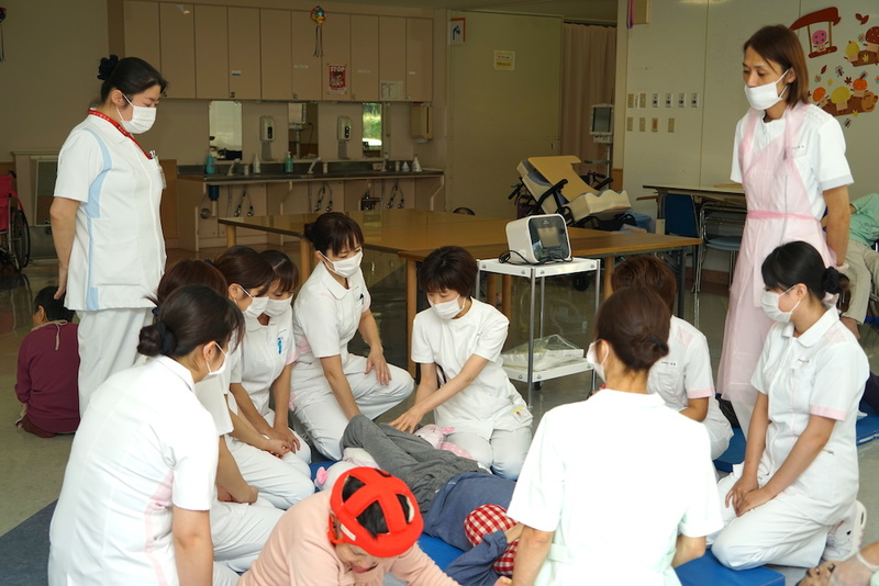 当院では災害発生に備えた訓練を1年に一度実施しています。敦賀市には原子力発電所があり、大規模な地震が発生し、原発事故にまで発展した際には入院している重症心身障害児(者)の皆さんを連れて避難しなくてはなりません。
