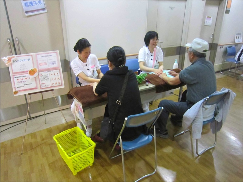 寝たきりの患者さんや、入浴することが難しい患者さんを中心に、よい香りのするアロマやソープを使用した、ハンドケアやフットケアを実施しています。患者さんご本人がお好きなボディソープやアロマオイルを取り入れ、体を清潔にするだけではなく、心地よく過ごせるお手伝いをしています。これらの取り組みは「出前保健室」でも行われ、看護師によって地域の皆さんに提供しております。
