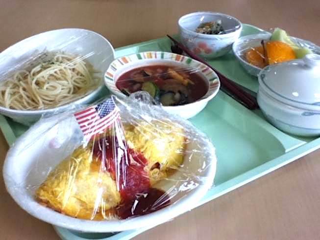2018年7月4日のアメリカの独立記念日の当日の病院食に、星条旗のついたオムライスが患者さんに出されました。毎日、約900食を作る栄養部のメニューとしては、かなり手のかかる料理です。