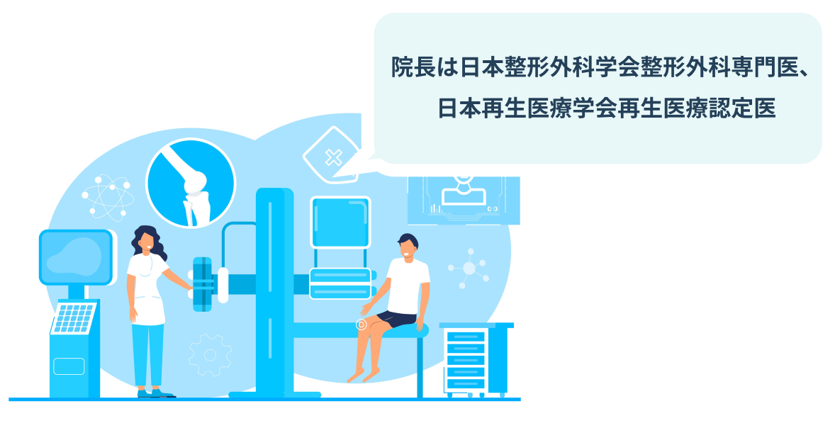 当院は国に再生医療等提供計画を届出済みであり、幹細胞による再生医療を提供することが可能な医療機関です。院長は日本整形外科学会認定の整形外科専門医、日本再生医療学会認定の再生医療認定医の資格を持っています。1996年に慶應義塾大学医学部を卒業後、同大医学部整形外科に入局し、慶應義塾大学関連病院の整形外科で勤務。2004年にスタンフォード大学工学部に留学し、客員研究員として膝関節の動作解析および軟骨のMRI測定について研究しました。