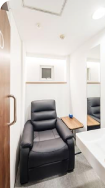 大腸カメラの前に下剤を飲むための準備室を作りました。初めての検査で自宅で下剤を飲むのが不安な方もいらっしゃるため、ここでゆっくり準備ができるようにしています。準備室は半個室と完全個室を用意し、完全個室内にはお手洗いも作りました。Wi-Fiやコンセントもあり、カフェにいるようなリラックスした気持ちで過ごしていただけると思います。検査後はリカバリールームで休んでいただきながら鎮静薬の効果が切れるのを待ち、検査結果をお伝えする流れになります。個室・半個室は初めての検査の方や遠方からご来院の方などに特に人気です。お部屋の数に限りがあるため、ご希望の方は早めにお伝えください。