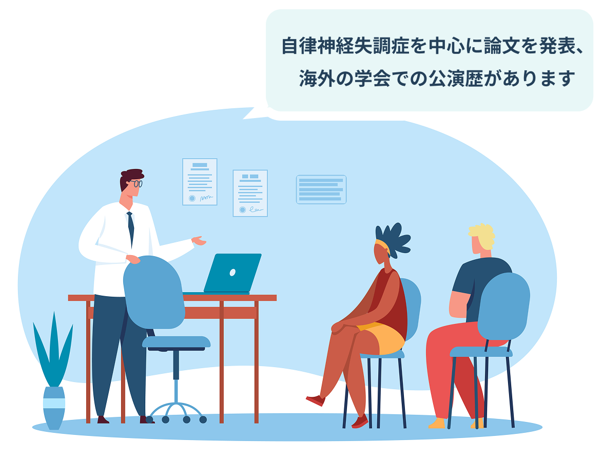 東京慈恵会医科大学附属病院の精神医学講座や、横手興生病院、東京慈恵会医科大学附属柏病院に勤務。そののち、東京慈恵会医科大学附属病院にて医局長や病棟長として現場での後進育成にも携わってきました。現在も当クリニックの院長を務めるかたわら、毎週木曜日は同大学病院で非常勤診療医長として診療にあたっています。また研究活動も行っており、専門とする認知症や自律神経失調症(身体症状症)を中心に国内外問わず論文を発表した経験があるほか、海外学会での講演歴もあります。