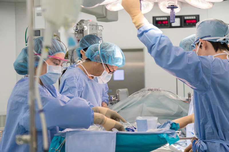 食道から肛門までの消化管全般の病気と腹腔内実質臓器の病気の外科的治療を行っています。最近は良性疾患にとどまらず悪性疾患も適応を選び、侵襲の少ない腹腔鏡下手術を行っています。手術室の腹腔鏡下手術のモニターは高画質のハイビジョンや3D画像を採用しており、従来の手術方法よりも安全で、細かい作業に対応できる手術が可能となっています。「腹膜播種センター」では、腹膜に進展した難治性疾患、たとえば腹膜偽粘液腫や中皮腫、大腸がんの腹膜転移などを腹膜切除と温熱化学療法で治療を行います。日本では腹膜切除を行える施設が少ないため、日本各所から患者さんが紹介されてきます。治療成績は腹膜偽粘液腫の手術例で5年生存率が66%に達しています。「肥満外科センター」は糖尿病や高血圧、脂質異常症を伴う高度肥満症の患者さんに対し腹腔鏡下スリーブ状胃切除術を行っています。難度の高い手術ではありますが、術後は体重減少とともに糖尿病や高血圧も改善します。医師や看護師、管理栄養士、臨床心理士などの多職種協働で治療に当っています。
