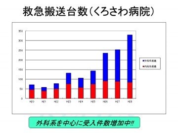 また、救急車の受け入れも近年特に力を入れており、2016年度は内科系・外科系疾患合計で300件以上の救急搬送を受け入れました。2009年の約60台と比べ、5倍前後増加していることになります。
