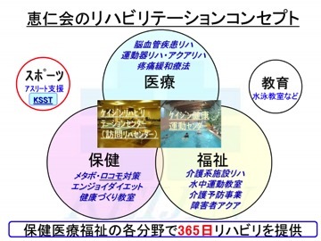 当院では長年、リハビリテーションに力を入れてきました。リハビリテーションが重視されていなかった頃から多くの人員を採用しており、2017年現在のリハビリテーションスタッフは法人全体で、事務、鍼灸マッサージ師、作業療法士、理学療法士、言語聴覚士、健康運動実践指導者、健康運動指導士を合わせて約70名にのぼります。これまえ医療・保健・福祉の3つを大軸に、脳血管疾患やロコモティブシンドローム(運動器症候群)対策、介護予防事業などの様々なリハビリテーションに取り組んできました。患者さんにしっかりとリハビリテーションが行き届くよう、当法人のもつ全施設にセラピストを配置したり、訪問リハビリテーションを3名体制で実施したりすることで、シームレスで広範囲のリハビリテーションを実現しています。