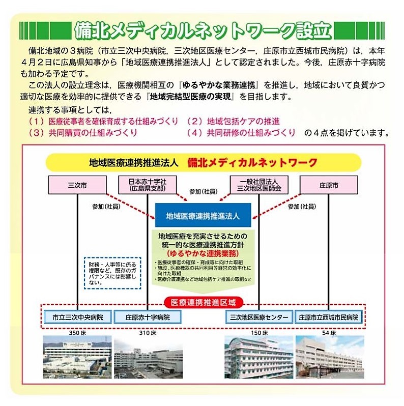 そういった意味でも、地域連携推進法人「備北メディカルネットワーク」をつくりました。このネットワークのなかに、民間の医療機関や介護事業も含め、地域住民のみなさまにとって安全で安心な医療を提供できる体制を地域全体でつくってまいります。