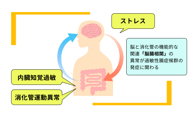 過敏性腸症候群の発症には「ストレス」「内臓知覚過敏」「消化管運動異常」の3つの要因があり、これらが単独ではなく互いに影響し合う「脳腸相関」が病態に大きく関わっていると考えられています。