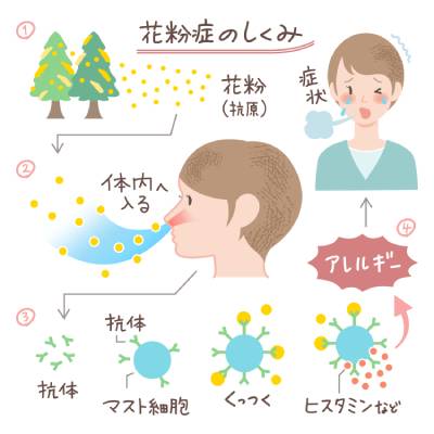 *花粉症発症のメカニズム:ヒトの体は、病原体などの「異物(抗原)」が入ってくると、免疫のはたらきによって排除しようとする。免疫システムが花粉を抗原と認識するようになると、排除するためにIgEという抗体が産生され、免疫細胞の一種「マスト細胞」と結合。そこに花粉が“付着”すると炎症を引き起こす化学物質であるヒスタミンやロイコトリエンなどが放出され、アレルギー反応が起こる。抗ヒスタミン薬やロイコトリエン拮抗薬は、ヒスタミンやロイコトリエンの鼻や目の粘膜細胞への作用を抑えることで症状を改善する。
