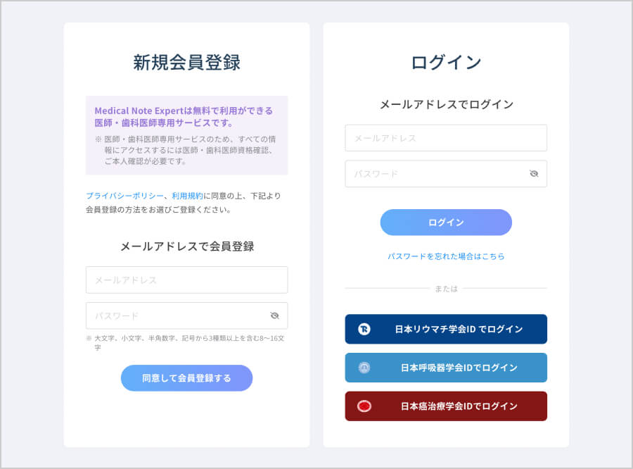 『Medical Note Expert ID』でログインもしくは新規登録でログイン可能です。
