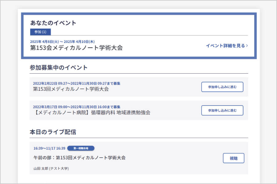 申し込み完了後「あなたのイベント」欄に申し込んだウェビナーが表示されているかをご確認ください。