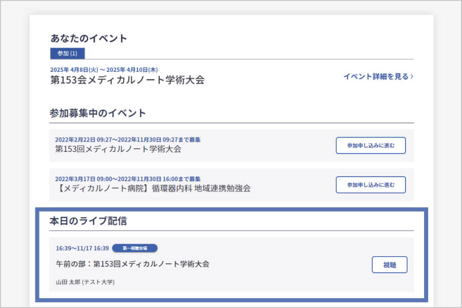 ウェビナー当日は、「本日のライブ配信」欄の「視聴」ボタンをクリックして視聴にお進みください。